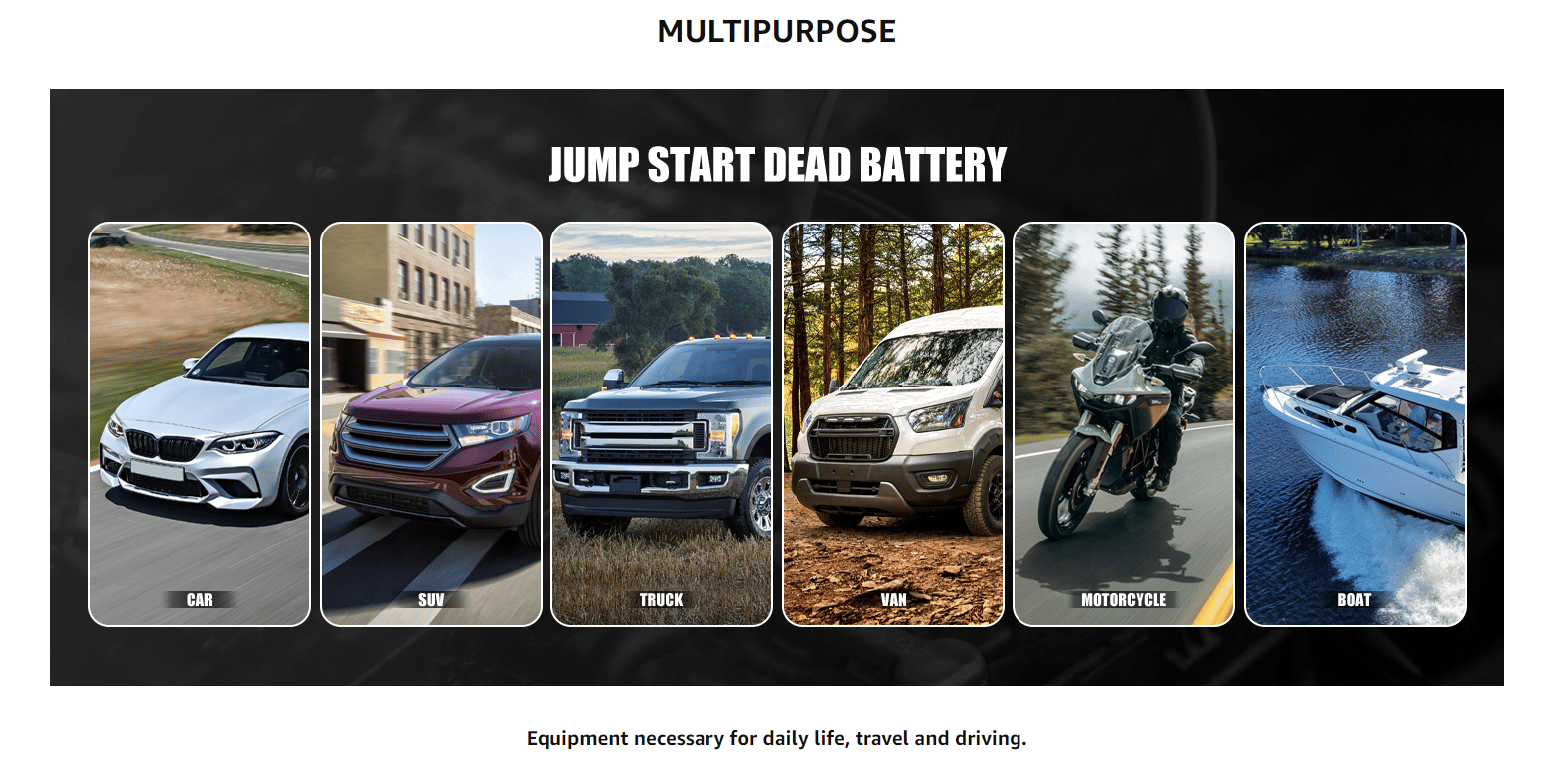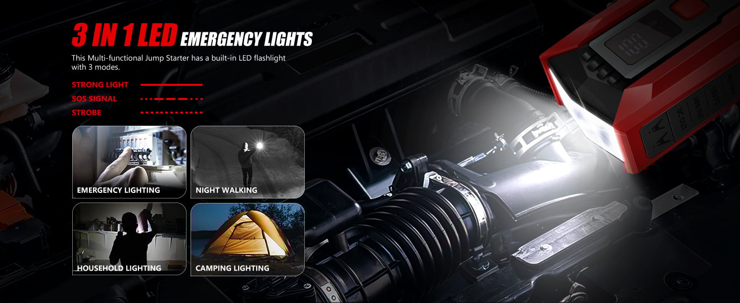 3-IN-1 LED EMERGENCY LIGHTS - This Multi-functional Jump Starter has a built-in LED flashlight with 3 modes (strong light/flash/SOS) for illumination purposes or to signal an emergency.