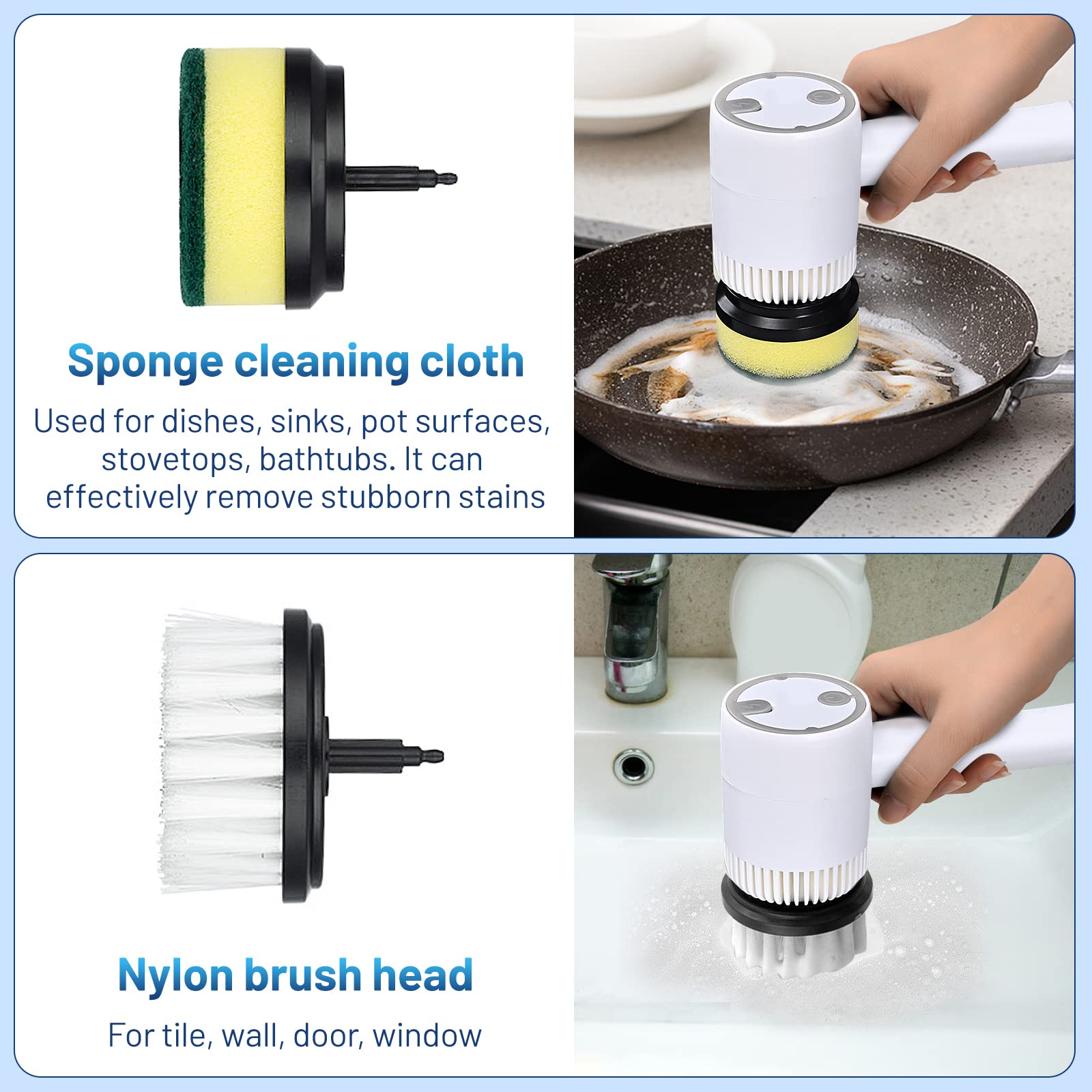 6 in 1, Multi-Purpose: With 2 Interchangeable cordless spin scrubber brush heads, easy to install and remove, so you can clean different surfaces easily. The bristles are made of ABS friendly material, with higher density and hardness, more durable and long-lasting. The different types of brush heads cater to all cleaning areas in kitchens and bathrooms, such as floors, tiles, bathtubs, ovens, stoves, sinks, pots and pans, etc. Any corner can be clean as new!