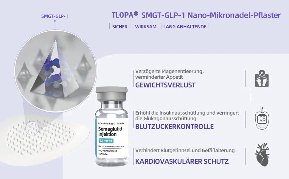 The nano-microneedle patch contains SMGT-GLP-1 in each patch. It mimics the action of glucagon-like peptide-1 (GLP-1), promoting insulin secretion, inhibiting glucagon secretion, and delaying gastric emptying, thus contributing to blood sugar control and aiding weight loss.