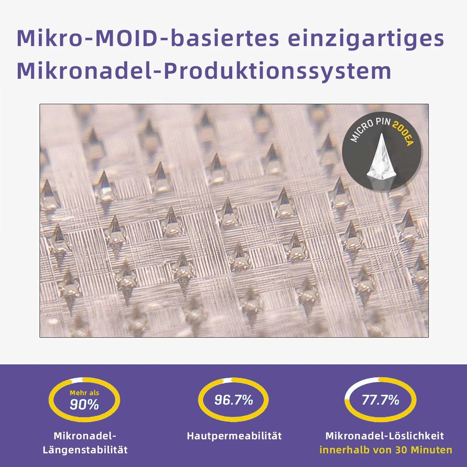 Each needle is 0.27 mm  long, just 1/7 the thickness of a hair ,  and contains  soluble medication .  These microneedles are precision-engineered using state-of-the-art manufacturing techniques to ensure a seamless, painless experience while effectively delivering active ingredients directly into the skin.