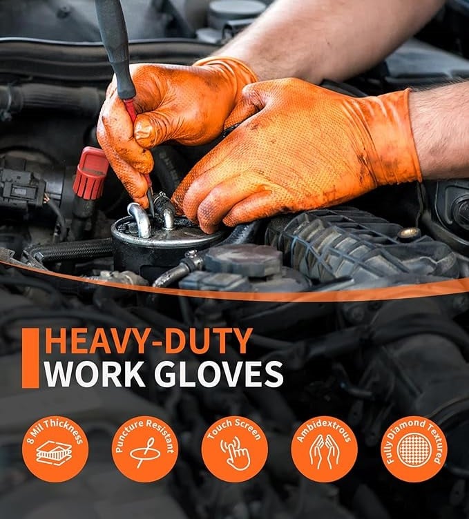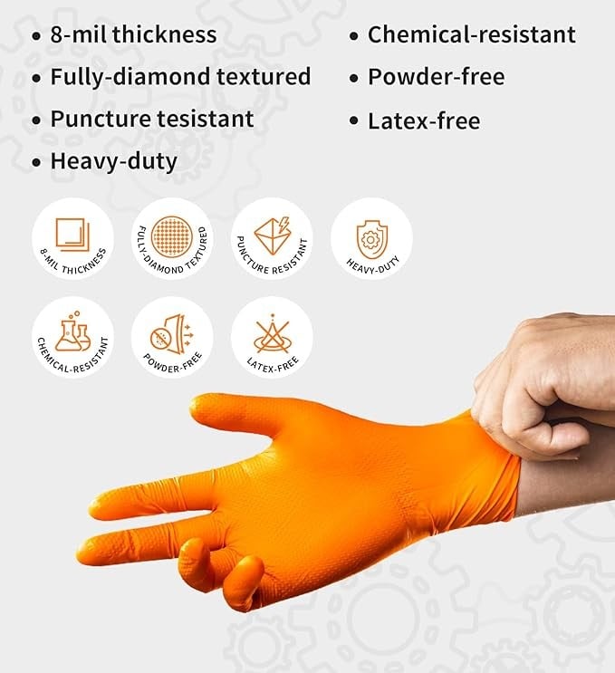8-mil Thickness - The heavy-duty orange nitrile gloves are 8-mil extra thick with superior strength, puncture resistant, and won't rip or tear easily.