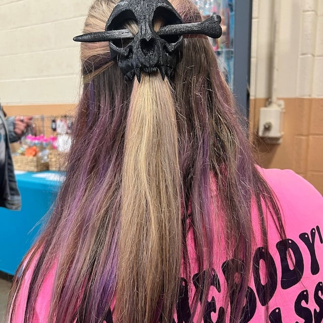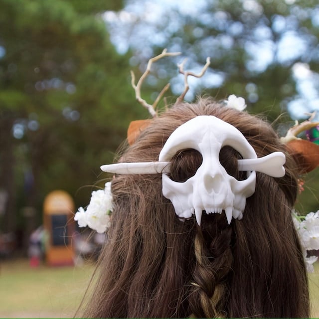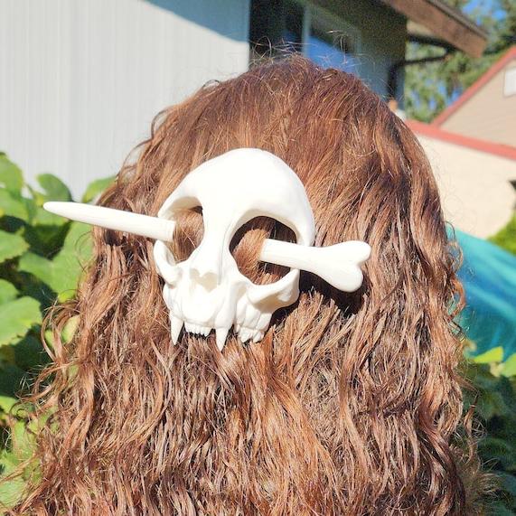 Recommended for medium to long hair. It's perfect over a french braid or partial updo. You will need to secure your hair in your chosen style before adding the skull.